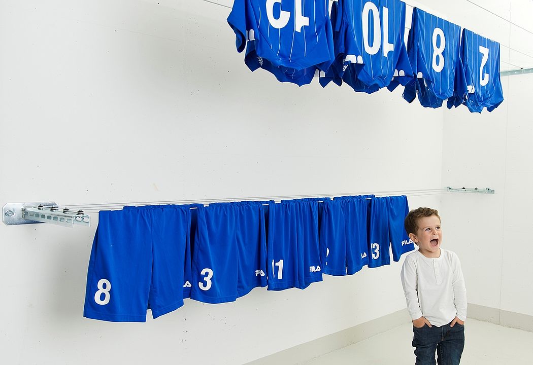 Das montagefertige Normsec Junior-Wäscheleinensystem mit 40 cm Breite. Diese Wäscheleine wird in beliebiger Höhe an der Wand befestigt. Entweder als Ergänzung zu einem großen Wäscheleinensystem oder, mit immerhin 15 Meter Wäscheseil, auch als einzelne Wäscheleine.